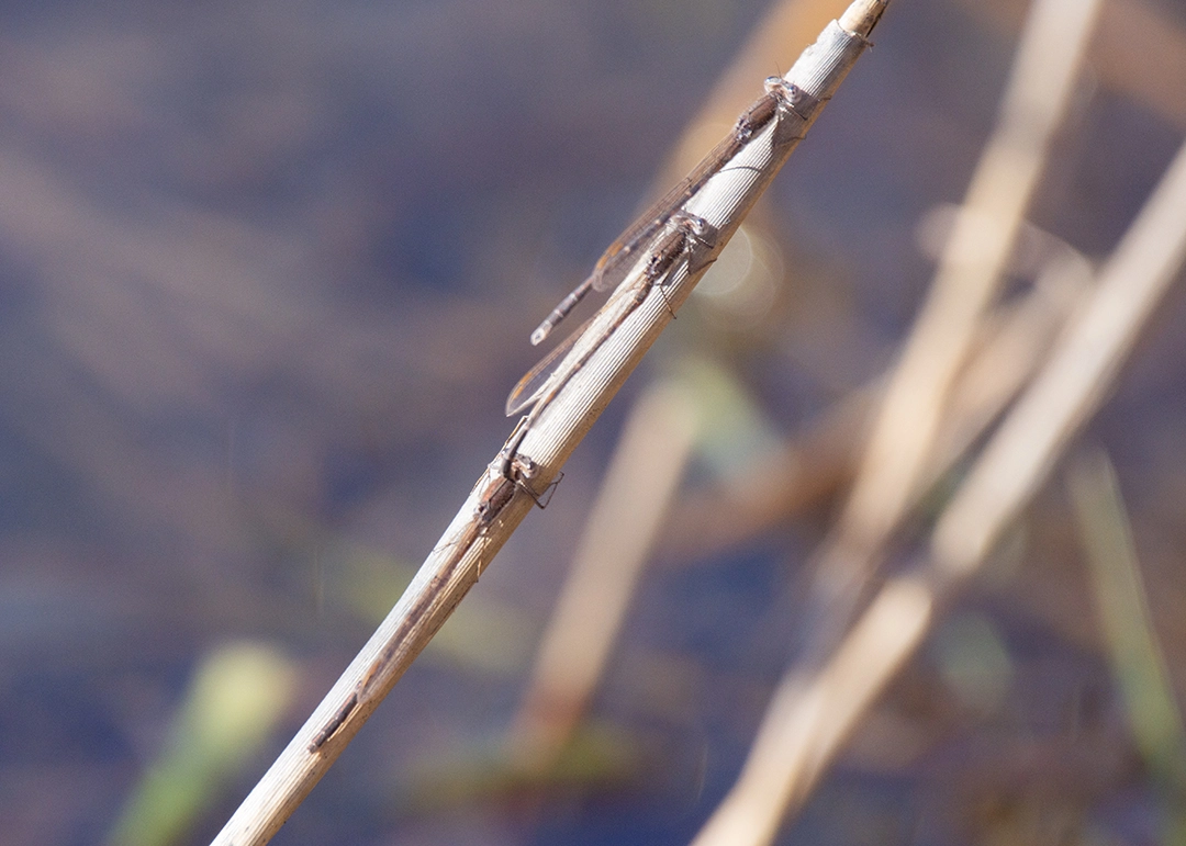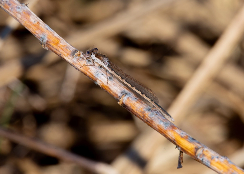 Bon, vous l’aviez deviné, ils n’avaient pas disparu, mais les Lestes bruns émergés en juin 2025 étaient allé maturer loin des points d’eau et passé l’hiver au chaud dans les broussailles, sortant quand les températures un peu clémentes les autorisaient à partir chasser quelque petit diptère trop confiant.